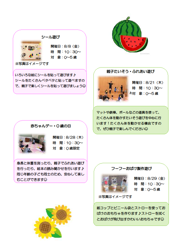 8月は暑さもありますので、園庭開放だけでなく、室内の開放も行います!