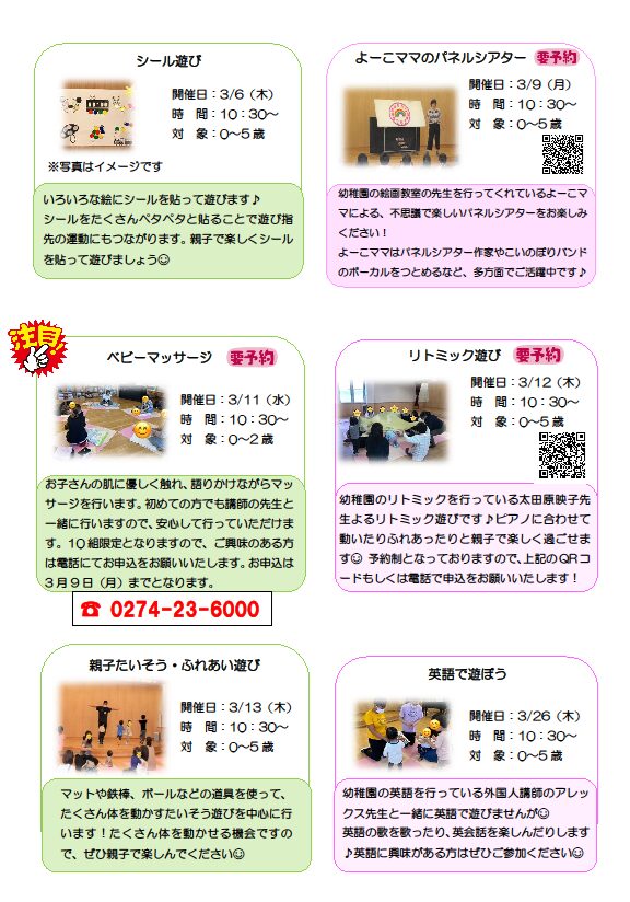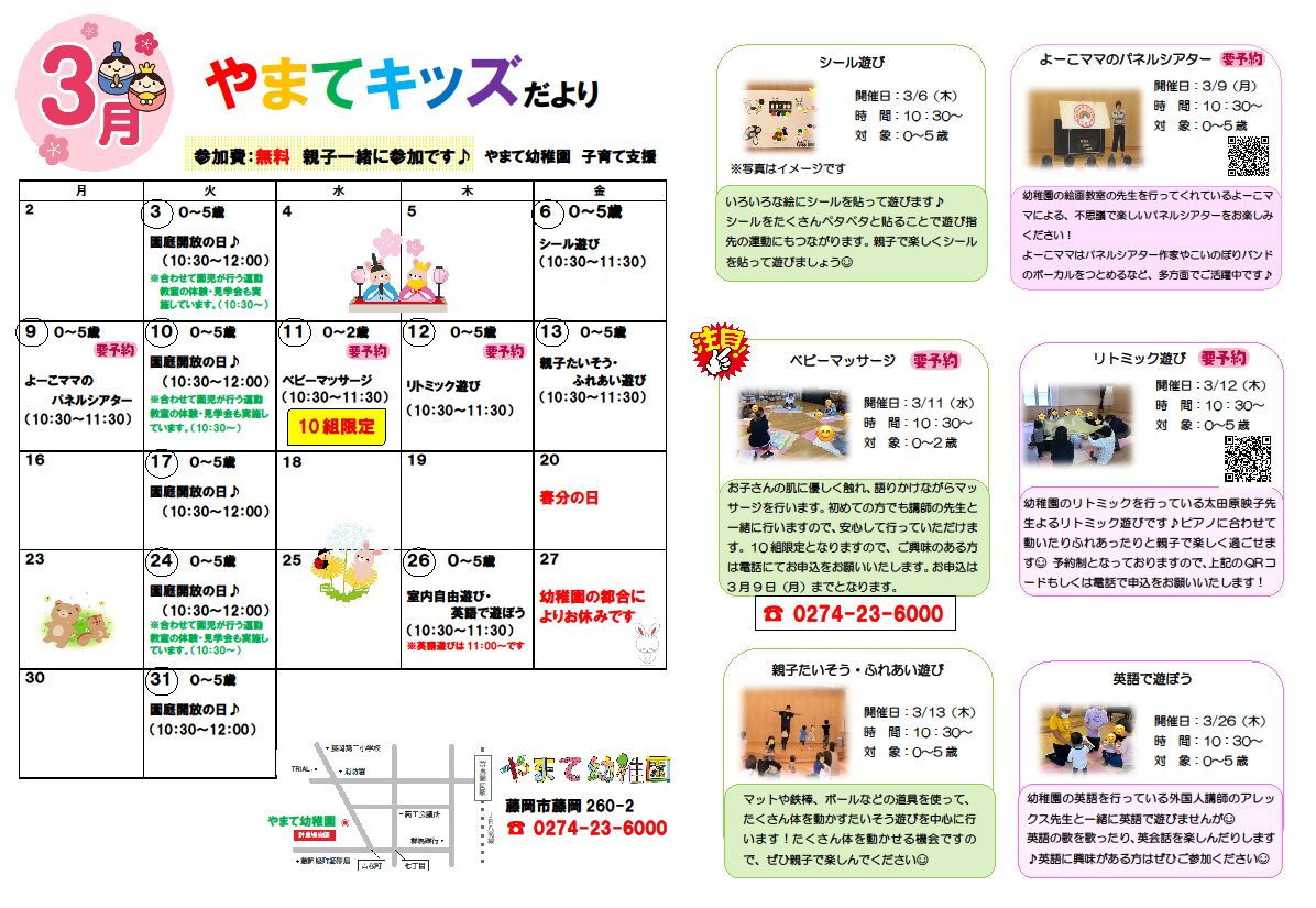 3月のやまてキッズのお知らせ🎵3月のやまてキッズのお知らせです🎵 だんだんと春の訪れが感じられる季節となってきました🌞3月も元気よくやまてキッズを行っていきます🌝 前回好評だったベビーマッサージの2回目を3月11日(水)を行います👶 ご興味のある方はぜひご参加ください! 10組限定となっておりますので、お申し込みは電話にて受け付けております! その他の回もぜひたくさんご参加ください🌝よろしくお願いいたします!