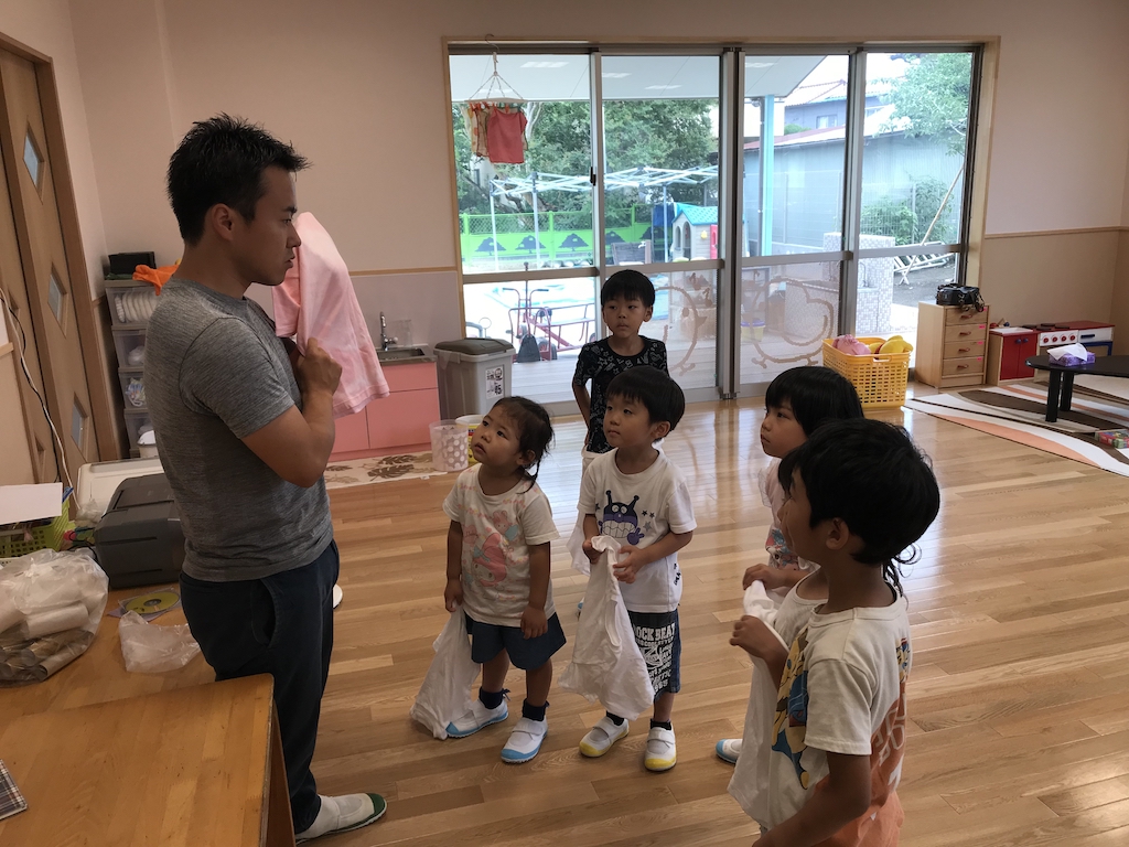 そめあそびの準備part2明日のそめあそびに向けて、白のTシャツにデザインをしました! 割り箸やスーパーボールを使って、シャツに輪ゴムをはめて染めると、輪ゴムの部分だけに色が入らないので、きれいな模様になります! 明日どんなデザインになるか楽しみだね♪