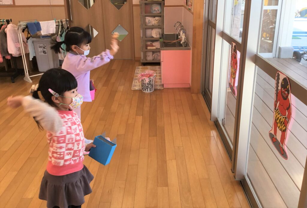 イラストの鬼に向かって手作りの豆と豆入れを持って、元気に豆まきをしました👹